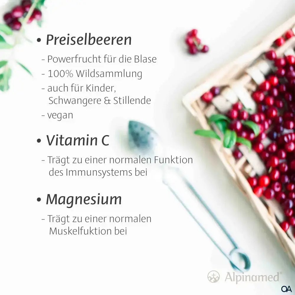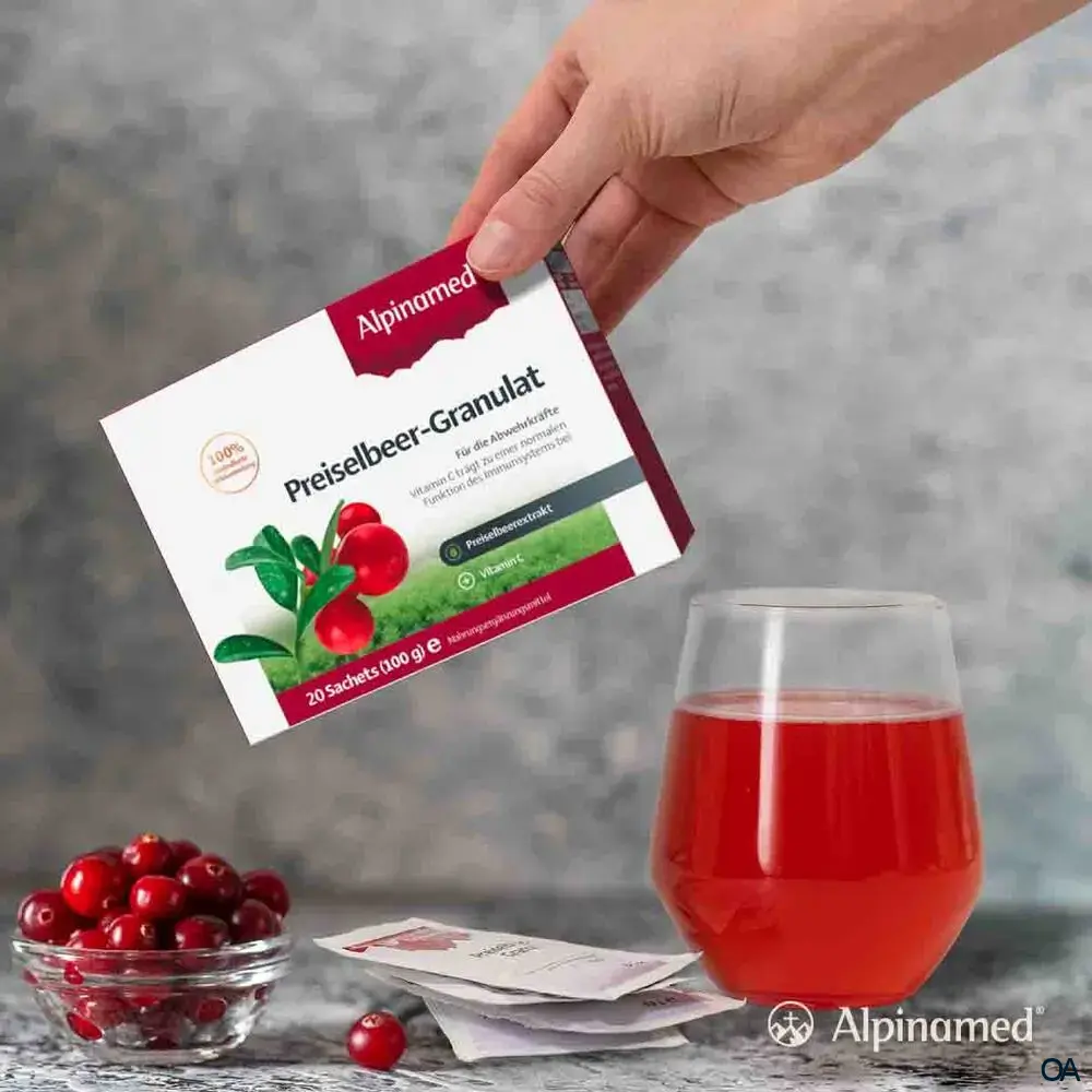 Alpinamed® Preiselbeer-Granulat sind ein Nahrungsergänzungsmittel mit Preiselbeerextrakt und Vitamin C, zur Unterstützung der normalen Funktion des Immunsystems und der Blase.