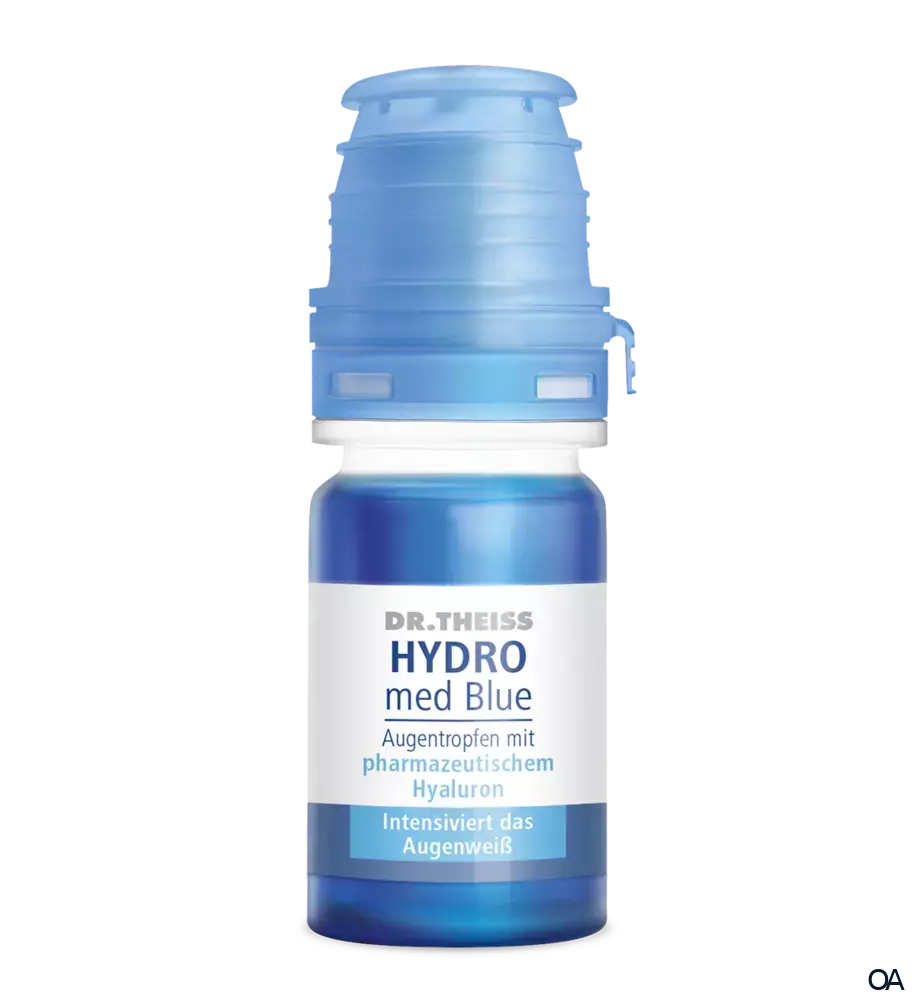 DR. THEISS HYDRO med Blue Augentropfen sind ein Medizinprodukt mit pharmazeutischem Hyaluron. Befeuchtung und Pflege trockener Augen, mindert Rötungen und intensiviert das Augeneiweiß.