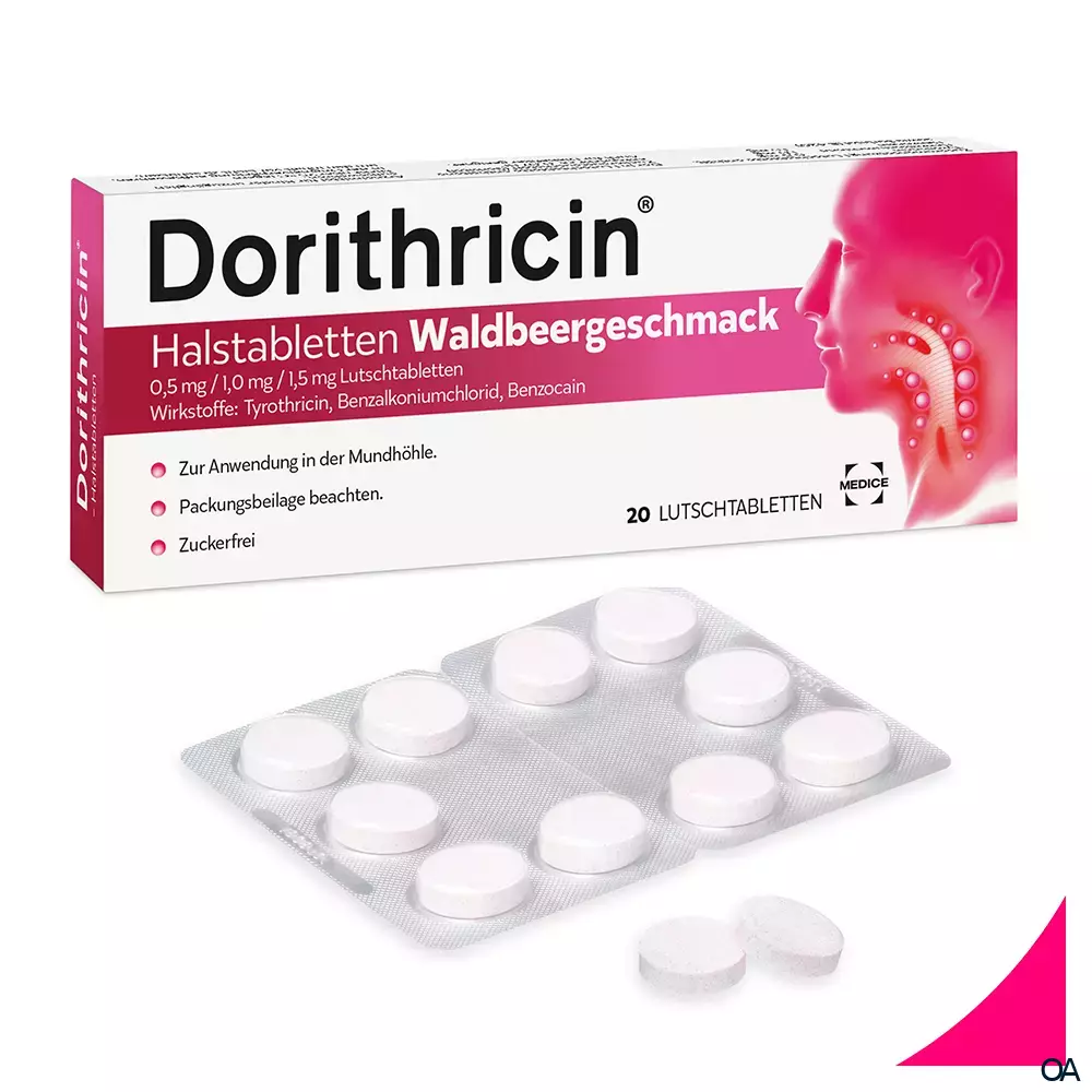 Dorithricin® Halstabletten Waldbeergeschmack enthalten als Mittel zur oberflächlichen Betäubung Benzocain sowie die keimhemmenden und keimtötenden Substanzen Tyrothricin und Benzalkoniumchlorid. Aufgrund dieser Wirkstoffkombination wird dieses Arzneimittel als Mund- und Rachentherapeutikum eingesetzt.