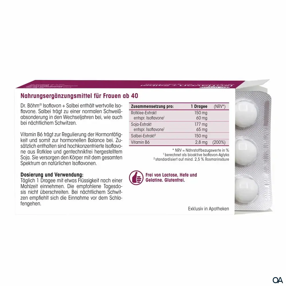 Die Dr. Böhm® Isoflavon + Salbei Dragees sind ein Nahrungsergänzungsmittel mit 125 mg Isoflavone und 150 mg Salbei-Extrakt pro Dragee. Die effektive und hormonfreie Kombination zur Unterstützung für die Wechseljahre.