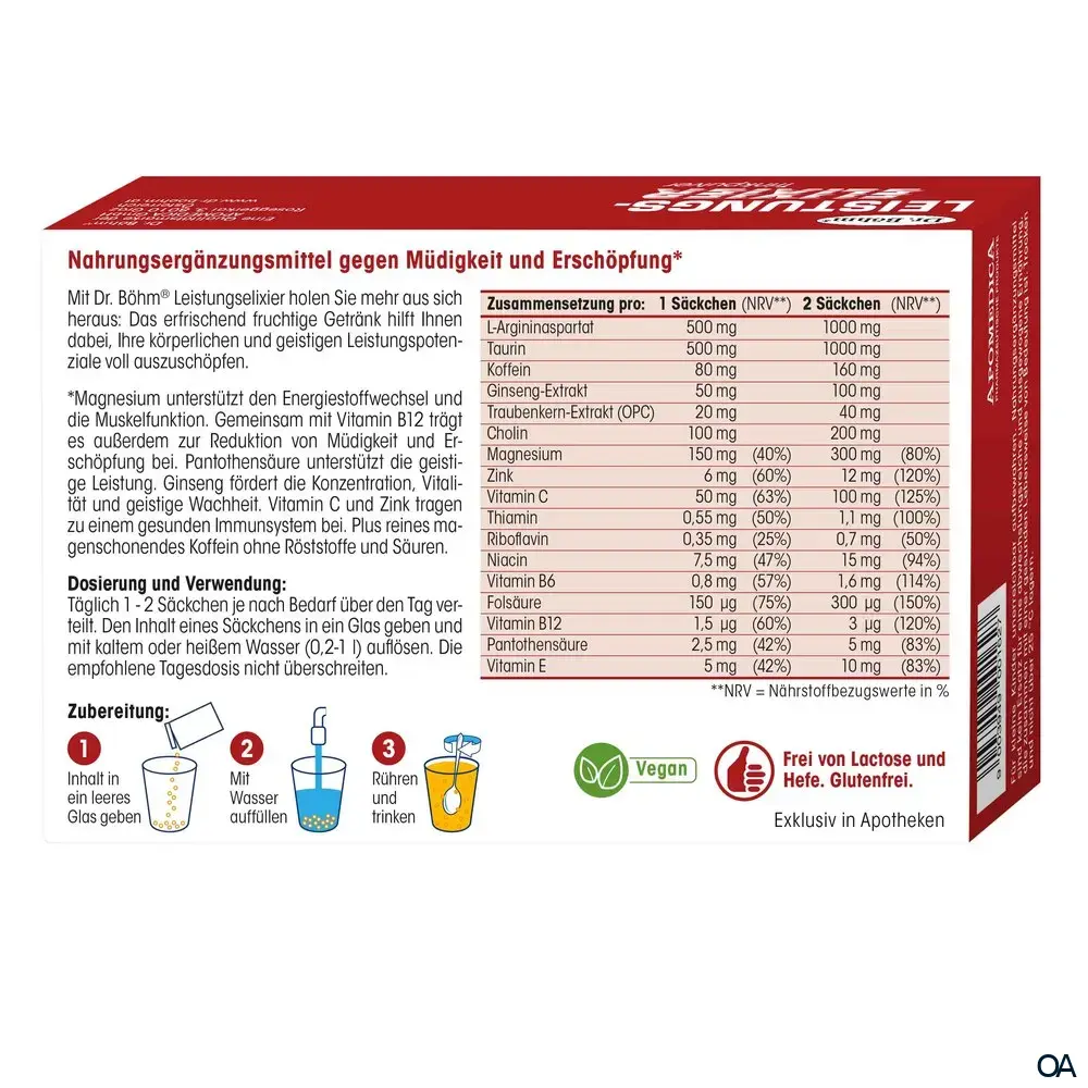 Dr. Böhm® Leistungselixier Brausegranulat ist Ihr natürlicher Energie-Booster für Konzentration und Leistungsfähigkeit. Mit einer einzigartigen Kombination aus Koffein, Ginseng und B-Vitaminen unterstützt es Sie bei körperlicher und geistiger Anstrengung.