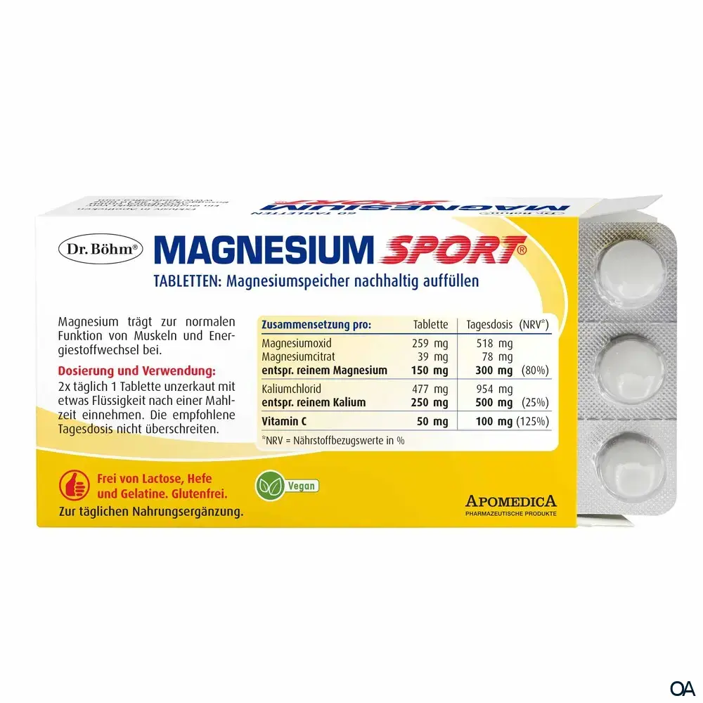 Dr. Böhm® Magnesium Sport® Tabletten wurden speziell für Sportler und Menschen entwickelt, die durch körperliche Anstrengung einen erhöhten Bedarf an Magnesium und Kalium haben. Sie helfen Ihnen dabei, die Magnesiumspeicher und Kaliumspeicher Ihres Körpers langfristig aufzufüllen. Die geschmacksneutralen Tabletten im hygienischen Blister sind Ihre ideale Basisversorgung in der Sportsaison.