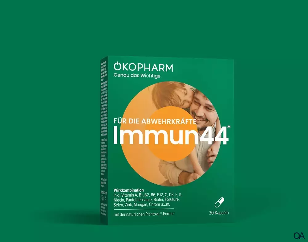 Ökopharm® Für die Abwehrkräfte Immun44* Kapseln sind ein Nahrungsergänzungsmittel zur Unterstützung des Immunsystems. Sie enthalten einen einzigartigen Wirkkomplex aus Vitaminen, Mineralstoffen und Spurenelementen, die für die Funktion des Immunsystems wichtig sind.