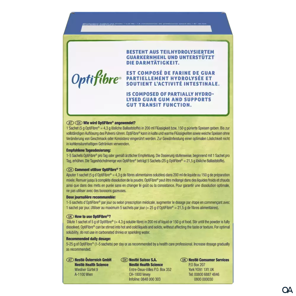 • OptiFibre ist geschmacksneutral und kann daher in allen Flüssigkeiten verrührt werden. Die exakten Dosierungsanweisungen nach Alter und Art der Anwendung finden Sie auf der Verpackung des Produkts. Der Hersteller empfiehlt zum Start 1 Stick bzw. 5 g OptiFibre Pulver pro Tag in ca. 200 ml Flüssigkeit zu verrühren. Zur weiterführenden bilanzierten Diät können täglich 1 - 5 Sticks eingenommen werden.