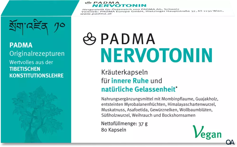 PADMA Nervotonin Kräuterkapseln ist ein Nahrungsergänzungsmittel für innere Ruhe, natürliche Gelassenheit und für eine normale Funktion des Nervensystems. Pflanzliches Nahrungsergänzungsmittel nach Tibetischer Konstitutionslehre mit Mombinpflaume, Gujakholz, Myrobalanenefrucht, Costuswurzel, Muskatnuss, Asafoetida, Gewürznelke, Wollbaumblüte, Weihrauch und Bockshornsamen.