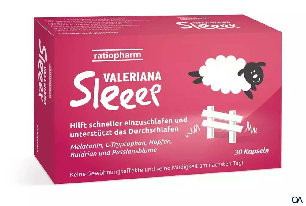 Valeriana Sleeep ratiopharm® ist ein Nahrungsergänzungsmittel, welches 5 charakteristische Inhaltsstoffe beinhaltet: Melatonin, Hopfen-, Baldrian- und Passionsblumenextrakt, L-Tryptophan. Die in Valeriana Sleeep ratiopharm® enthaltenen Substanzen helfen die Einschlafzeit zu verkürzen und fördern einen ruhigen, gesunden und entspannten Schlaf.